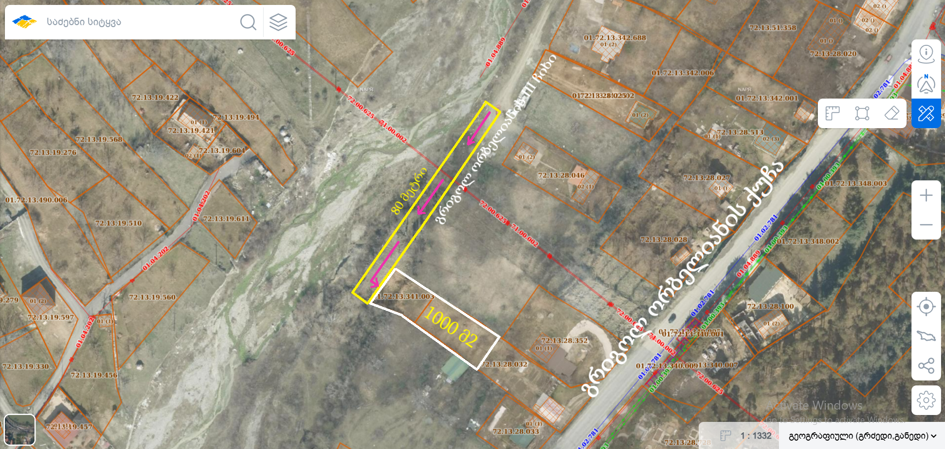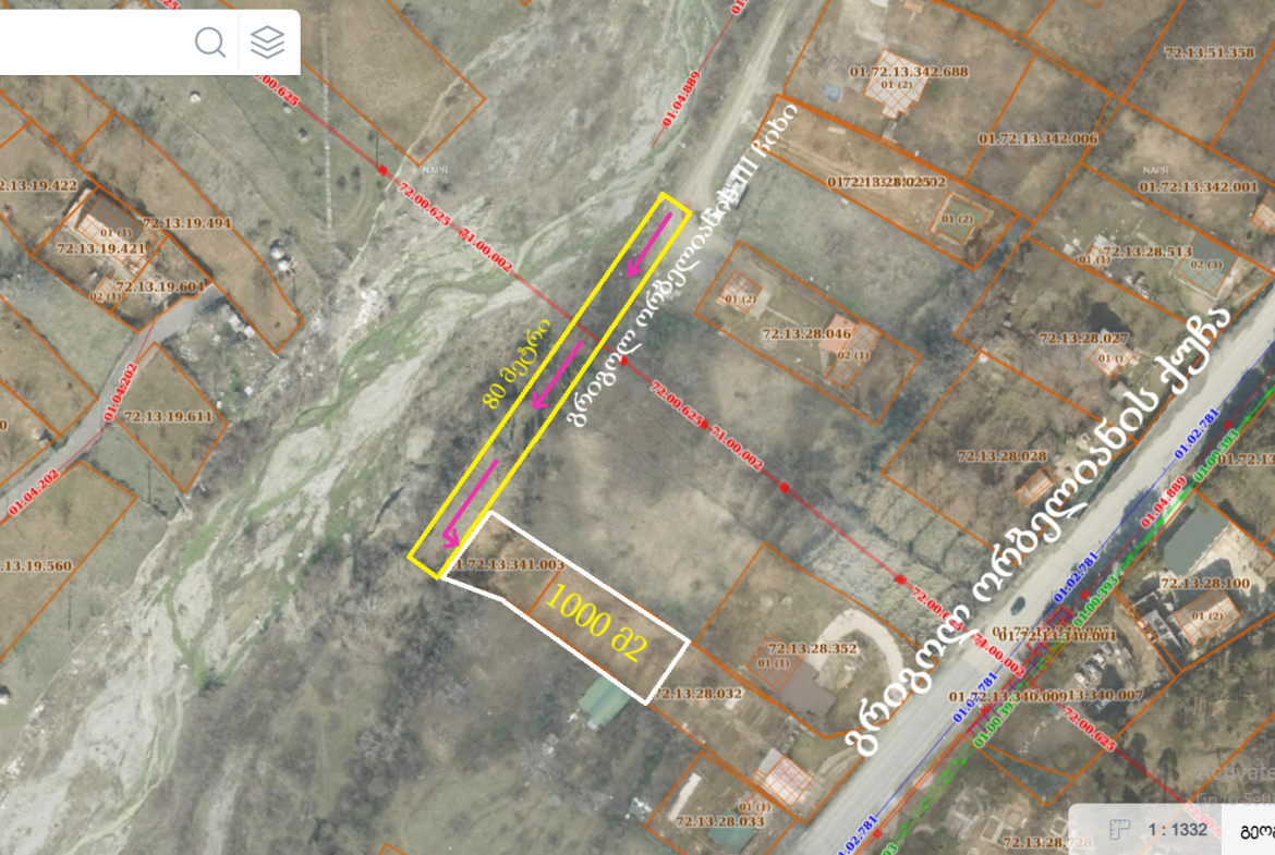 P.S. ნაკვეთთან მისასვლელად საჭიროა 80 მეტრი სიგრძის მისასვლელი გზის მოწყობა მძიმე ტექნიკით (JCB ტრაქტორი), აღნიშნული სამუშაო შესრულდება მყიდველის მიერ თავად, რაც ფასზე მოლაპარაკების დროს იქნება გათვალისწინებული.